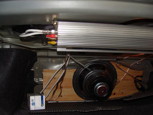 фанерных листов, по 20 мм каждая и вставлен за задним сиденьем ,проводку делал силиконовым кабелем 2,5 квадрата ,силовые кабеля отдельно плюс и минус по 35 кв каждный ,были брошены по лонжерону ,прихвачены стальными стяжками к топливным трубкам ,естественно каждый в своей стальной оболочке, для саба поставил кросовер с кетайской головой все это вроде как работало ,но чего-то не хватало |