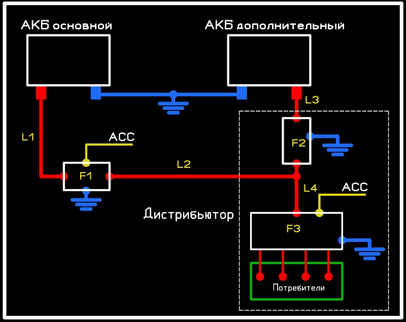 Вариант дистрибьютора для установки в багажнике, с подключением дополнительного АКБ, с отключением от главного аккумулятора (генератора) и подключением зарядки только при заведённом двигателе. Без плавких предохранителей (без заужений сечений проводов на линиях), с общим током нагрузки до 80А, с моментальным срабатыванием (отключением от линии питания) при коротком замыкании со стороны потребителей.