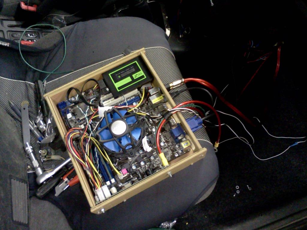 1Ггц проц, пол гига ОЗУ, 7” экран емкостный. Установил, поездил – не понравилось: -маленький экран -плохой звук(магнитола за 1.5т.р. лучше играет) -глючные прошивки(зависает, выключается и т.д.) -невозможность подключения BT, регистрации, GPS, внешней звуковухи(на то время) и организации их стабильной одновременной работы Короче продал его и спустя пол года начал закупать комплектуху для полноценного Car PC. Сразу говорю, проект бюджетный. Т.к. студент я. Летом немного подзаработал и решил начать. Было куплено: - Сенсорный монитор AT080TN64 Вполне нормальный, даже работает, 8 дюймов, разрешение конечно не очень 800 на 480, но думаю пока пойдет, да и выбирать особо не из чего. - БП M2-ITX Теперь железо: Сначала хотел покупать на плату asrock e350 mini itx. Но все же пришел к выводу что её мощности будет маловато. И выбор пал на процессор Intel G530 на 1155 сокете, и какую нибудь материнку mini или micro ATX(с поисками mini itx не стал заморачиваться). По деньгам почти тоже самое, мощность выше в разы чем e350, а потребление энергии будет, я думаю, не на много больше. Итак, было купленно: - Материнская плата Soc-1155*ASRock H61 U3S3 Есть сата 3, усб 3.0. - Память DIMM DDR3 4096MB PC10600 1333MHz Samsung orig - Процессор Intel Celeron G530 2.40GHz 2Mb 2xDDR3-1066 HD Graphics TDP-65w* - судя по отзывам потребляет не более 30 ватт и стоит немного, у меня температура в простое 25градусов - СДД жесткий диск OCZ 60 gb - думаю 60 гигов хватит вполне. Винда 5, музыка максимум 40, ну и на софт всякий место остается. На всякий случай потом можно подключить внешний жесткий диск через USB 3.0 Сборка корпуса для монитора Т.к. я работал с ПВХ констукциями, то достал немного обрези профиля от балконных раздвижек. Из него и сделал корпус. Тут рассказывать нечего - все видно на фотках. Пока конечно она далека от идеала. Нужно еще точить, шпаклевать и затягивать в карбон. И вот что получилось Сборка корпуса Сначала хотел сделать корпус из обычного, железного, старого корпуса от компа. Но из этого ничего не получилось. Затем нашел остатки от паркета. Из него и собрал коробку - под размер материнки 22х26см. Корпус разместиться под сидением - по размеру как раз встает впритык. Сидение в любом положении его не задевает! Конечно корпус тоже надо доводить еще до ума - шлифовать красить. Но уже побыстрее охота все запустить и попробовать. куллер конечно большеват (6.5 см) - сидение прогинается и немножко его задевает, если там кто-то сидит. Но скоро придет низкопрофильный (3см) и корпус полностью закроется крышкой, ну и провода я думаю надо аккуратно проложить все. Установка в авто. Фото пациента)) Видел несколько проектов кар пс в десятку - все ставят монитор вместо центральных воздуховодов. Я решил усатновить монитор чуть ниже, т.к. не охота лищться их. Летом хоть както они спасают от жары, а зимою на них грею руки))) Монитор держится на 4х шурупах - стоит очень плотно. Пока что он выглядит вот так. Жду пока придет пленка с китая, чтоьы обтянуть его. Системник установлен под сидение. Корпус подошел как раз впритык. Итак, уже готово: -музыка/видео/игры + (в будущем планирую докупить внешнюю звуковую карту Creative "X-Fi Surround 5.1 Pro, но пока качество звука вполне устраивает) -интернет(мтс коннект - пользуюсь им и дома, скорость отличная) Что нужно еще сделать: -wi-fi - правда пока не знаю, нужен ли он мне -GPS -Видеорегестрация - пока остановился на Logitech c910 - думаю мой проц её потянет -Камера заднего вида -Диагностика, хотя есть бортовик, только