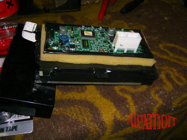 Для того чтобы штатный монитор влез на место часиков его нужно было уменьшить путём разборки и удаления некоторых деталей корпуса.Вырезаем кусок тонкого пластика,накладываем на плату и изолируем: Между заизолированными платами покладываем тонкий паралон,дабы избежать какого либо взаимодействия плат друг с другом: