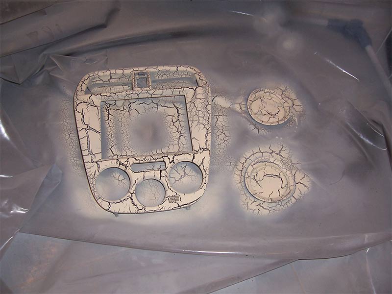 используемые материалы: двухкомпонентный пластелин шпатлевка грунтовка двуслойная краска с эфектом трещин а теперь процесс: слепил из пластелина зашпаклевал (забыл сфоткать) и загрунтовал, правая сторона не понравилась - ободрал опять загрунтовал первый слой краски черный второй бежевый итог |