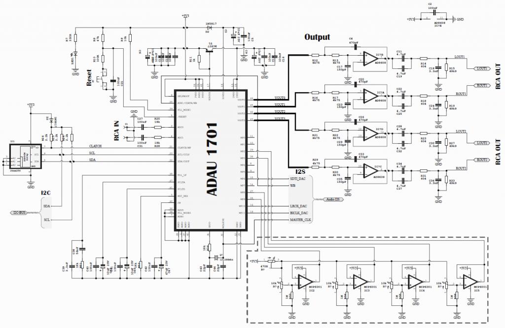 Набросал заново схему, добавил потенциометры (настраивать ими можно что хочешь, громкость, бас и так далее) выход I2S будет для двух каналов на AK4430, в итоге будет 6 каналов. Думаю использовать аудио-модуль Bluetooth 4.0 на CSR8635 с поддержкой USB, усилитель на TDA8950 и процессор STM32F105RB управляемый по Wi-Fi. Завтра выложу все схемы, для замечаний