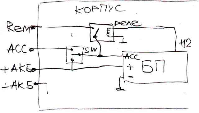 поставил трех позиционный переключатель на АСС(включено по замкузажигания-выключено-включено всегда), и приделал ремоут для усилков(через реле), теперь усилки без компа не включаются Вложение 3807 UBD REM - подключать к REM усилителя, использовано нормально разомкнутое реле, управляется +12 от БП (потребление реле 40mA) SW - трехпозиционный переключатель