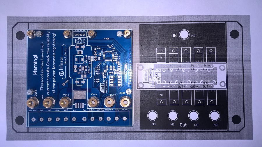 Сейчас в разработке силовой коммутируемый дистрибьютор питания с током нагрузки до 150А. Хочу попробовать его сделать на Mosfet - ключах, а не на механическом реле (контакторе). В первоначальной версии планирую использовать в "связке" с моим контроллером управления питанием, со всеми "плюшками", в виде отслеживания напряжения на АКБ, коммутацией с задержками, выключение по "КЗ" и по превышению температуры на терминалах, а так же, как отдельное устройство с управлением по кнопке. Пока только эскиз на бумаге - в поисках комплектующих (медных брусков, болтов с нужной закалкой...) и в ожидании платы управления с производства. Силовые терминалы будут из полностью медных брусков сечением 25мм х 35мм х 88мм, с резьбовым креплением для силовых проводов, обжатых в наконечники. Резьба шпилек (болтов) М8. Основание из стеклотекстолита толщиной 15мм (или из какого-нибудь полимерного материала).