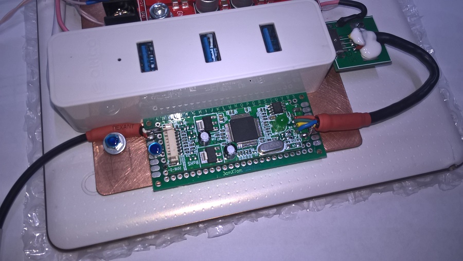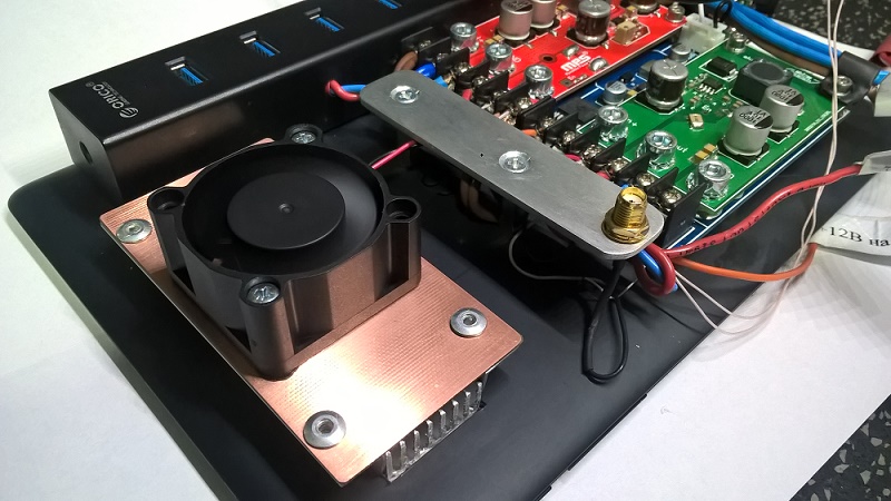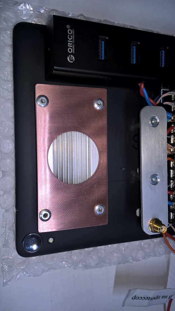 На уже знакомом "пациенте", не смотря на внушительный радиатор, наблюдался сильный нагрев процессора, что приводило к фантомным отключениям некоторых приложений. В частности пользователь стал замечать, что при одновременном проигрывании музыки через "USB Audio Payer PRO" и работающем "Яндекс-навигаторе", непредсказуемо по времени, воспроизведение прерывалось. При этом отваливания HUB-а, с подключенными внешними накопителями не наблюдалось. На столе в режиме тестов изменений напряжений на каналах питания планшета и HUB-а не увидел - всё стабильно при любых нагрузках, но "отвалы" музыки повторялись... Радиатор процессора при этом был очень горячий. Это повторялось с точностью "под копирку" при повторных тестах. Одним из решений было сделать воздушное охлаждение на радиатор процессора.