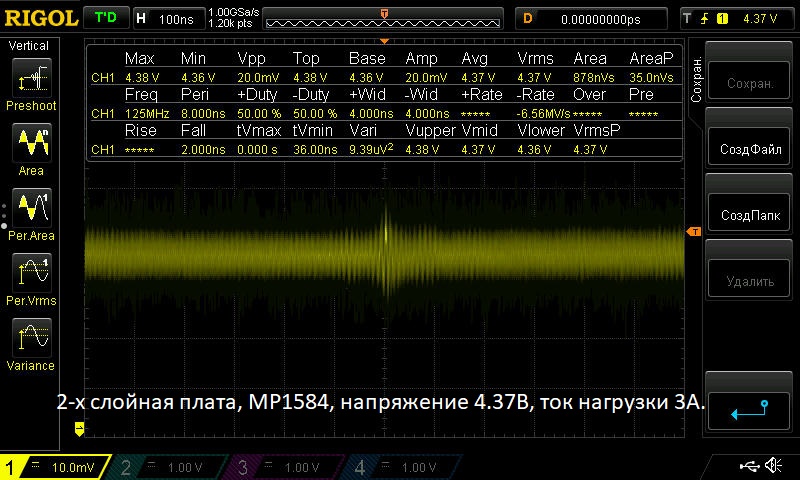 Небольшие изменения в трассировке платы отдельных модулей с током нагрузки 2,7А и 3,5А, и добавление нескольких элементов позволили улучшить выходные параметры напряжения. Теперь пульсации на выходе модулей при максимальных нагрузках составляют до 30mV.