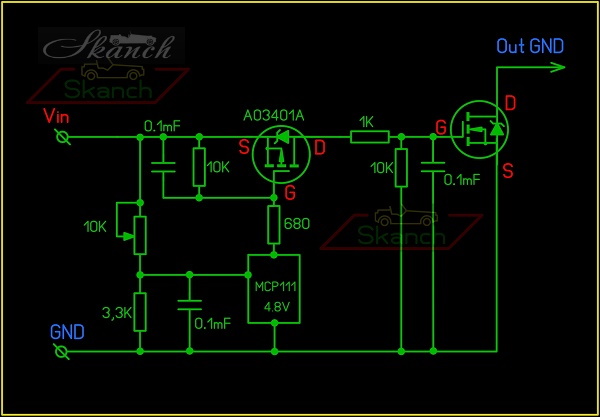 Это схема Вложение 51800 N-канальный транзистор на выходе можно использовать практически любой, подходящий по параметрам. Поскольку этим модулем можно управлять и нормально-замкнутым силовым реле подключения нагрузки, я решил использовать мощный Opti MOS Power-Transistor IPD80N04S3-06 Подключается непосредственно к "плюсовой" клемме АКБ коротким гибким шлейфом общим сечением 6 мм.кв., а так же для работы схемы к общей "массе" авто. Пока напряжение на АКБ в пределах нормы, на выходе модуля (подключается проводом к моему БП к соответствующему контакту) никакого потенциала нет, при снижении напряжения до установленного нижнего предела (11,5V), на выходе появляется отрицательный потенциал ("масса"), который сохраняется, пока на АКБ напряжение не поднимется до отметки 12,2V. При использовании этого модуля, отслеживание напряжения на АКБ становится более точным. Продолжительная нагрузка на выходе возможна до 20А. Размеры "коробочки": 3 см. х 2 см. х 1,5 см. Гибкий шлейф 6-8 см, с лужёным наконечником под винт М6. Схема внутри корпуса полностью герметична (залита компаундом) и термоустойчива к использованию под капотом авто. Вложение 51801 Вложение 51802 Вложение 51803 Вложение 51805 Вложение 51806 Если модуль отслеживания напряжения используется без моего блока питания, то в нём нет функции защиты от "просадок напряжения во время кручения стартером" и нормально-замкнутое силовое реле, подключённое через него, будет отключаться при падении напряжения до 11,5V. Если в схему ввести контроллер управления (например Ардуино), то на базе этого модуля можно сделать силовой блок управления нагрузкой с временными задержками включения/выключения и естественно с защитой от "просадок напряжения во время кручения стартером". Блок схема ниже Вложение 51807 |