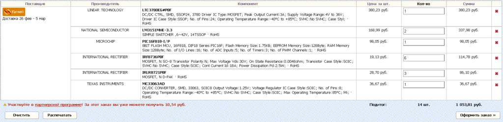 1. www.chipfind.ru - минимальная сумма заказа 500р, но доставка только EMS-отправлением(до меня больше 1000р). Вложение 15029 Можно заказать в том случае, если кто в Москве живет и сможет забрать товар у курьера на Митинском радиорынке в Москве, а потом остальным переслать. 2. www.prom-electro.ru - доставка 200р, но минимальная сумма заказа 1500р. Вложение 15030 Второй вариант предпочтительней, только нужно за 1500р перевалить - 2-3 человека. ГОТОВ к сотрудничеству. Albert.**** ну и задачку ты всем задал - и хочется и колется. МОЛОДЕЦ. |