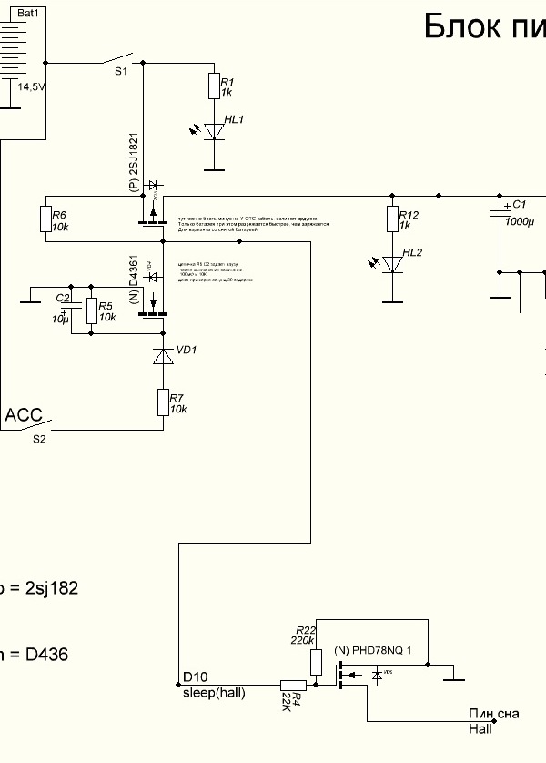 Вложение 41524 Я опишу а Вы поправьте: Ubat_real тут снимается сигнал контроля заряженности аккумулятора машины Uacc_real сигнал контроля напряжения acc? для ардуины ACC(s1) - сам ACC из машины AKBpin - разобрались (см ниже) Дальше сложнее: R5 R6 - Защита от ложных срабатываний для правильной работы транзисторов С2 - задержка отключения на кратковременное пропадание ACC S1 - отрубить все R1 - цепь питания светодиода HL1 При появлении ACC, его ток ограничивается через R7 (тк для управления нужно только напряжение) и происходит открытие транзистора VD4, который пропускает землю на затвор транзистора VD2, открывая и его и пропускаю питающее напряжение. Дальше не понял: То что на затворе VD2 появится минус при наличии acc, и этим минусом можно управлять OTG - это понятно. А вот как управляется транзистор управляющий датчиком холла не понятно, там вроде n-канальный транзистор и ему нужно подать "+" на затвор во время сна, откуда он возьмется? Через резистор R6 ? А то что это же напряжение появится и на отг - это не страшно? Зачем резистор R4? R22-защитный? почему такое большое сопротивление? И самое главное, в моем случае похоже нужно менять схему, тк управляющий сигнал у меня будет 5в (выход ардуины). По той же причине не подойдут мои транзисторы, тк судя по дата шиту, им нужно около 10в для открытия. Нашел еще у себя вот такие транзисторы: p50n03ld Для замены реле hall/otg - в моей схеме, мне нужно управлять напряжением 5в с небольшим током (сигнал от ардуины) и соответственно при его наличии/отсутствии закоротить землю на один из выводов (hall/otg). Подскажите, как это реализовать? |