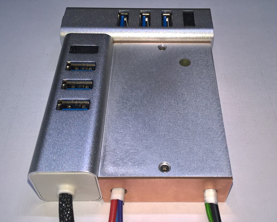 Вложение 51970Вложение 51971 ------------------------------------------------------- Эти микросхемы зарекомендовали себя, как одни из самых надёжных в эксплуатации и по отзывам пользователей сравнительно "малошумные". Ко всем достоинствам добавляется ещё и возможность обновления прошивки и программирования некоторых функций HUB-а. Компоновка классическая 4+4=7-два последовательно подключённых HUB-а, "минус" ещё один порт, который использует EasyCap для камеры "ЗХ", в итоге получаем 6 полноценных USB портов. Автономное питание решил сделать на DC-DC преобразователях ST1S41PUR, используя свои авторские модули. Вложение 51969 На каждую микросхему HUB-а свой отдельный модуль с размерами 36мм х 24мм., выполненных по топологии, которая позволила получить на выходе достаточно качественное напряжение +/-5V с током нагрузки до 3,5А (нужен радиатор определённого размера). Помещены они в самодельный корпус из алюминиевой профильной трубы, с внешними размерами 50 мм х 77мм и толщиной стенок 2 мм., выполняющий в том числе роль радиатора охлаждения для этих модулей. Оба корпуса HUB-ов жёстко соединены с дополнительным корпусом и составляют единую конструкцию. Вложение 51963 Ниже крышка корпуса, спаянная из двух пластинок стеклотекстолита по капиллярной технологии. Вложение 51980 Вложение 51964 Вложение 51965 Вложение 51966 Вложение 51967 Теплоотвод сделан через термопрокладку "3М", Вложение 51978 с дополнительной фиксацией винтом через корпус (для этого на каждом модуле припаял по сдвоенной гайке). Вложение 51979 Вложение 51981 Теплоотвод позволяет нагружать каждый из модулей током до 2,5А (тесты проводились при комнатной температуре, температура на корпусе микросхемы не превышала 55С. При токе нагрузки в 3,5A температура на кристалле 87С). Питание модулей рассчитано на диапазон от 4-18V, управление включением возможно по линии "АСС" (выведен отдельный провод). В режиме "сна" ток потребления каждого модуля 3μA (микроампера!), собственное потребление во включённом состоянии без нагрузки 2mA. Ток потребления готового HUB-а 12mA. При почти полной загруженности USB-портов (два внешних HDD по 500 гигабайт каждый, картридер, две флешки по 120 гигабайт) при кручении стартером и "просадке" напряжения на входе этого HUB-а "отвалов" USB соединений нет. Так же в корпус поместил EasyCap для камеры "ЗХ", подготовленный по варианту выше, что в целом позволило получить достаточно компактное универсальное устройство. Вложение 51972 Вложение 51982 Два USB-гнезда, которые используются для последовательного подключения HUB-а и EasyCap "прикрыты" силиконовыми заглушками. Вложение 51968 Самодельный USB кабель длиной 1 м., с двойным экранированием и с отсутствующей внутри него линией +5V. После перепрошивки HUB-а на крайнюю версию ПО и с подборкой наиболее оптимального режима его работы, Вложение 51973 Вложение 51974 (настройка конфигурации для каждой микросхемы составного HUB-а отдельная: для 7-ми портового две микросхемы, для 10-ти портового три и так далее...) Вложение 51975 получился очень достойный вариант составного USB концентратора, полностью с автономным питанием от бортового напряжения авто, управлением включения/выключения по линии "АСС", с раздельными линиями питания каждой микросхемы, силовых линий USB-разъёмов и с интегрированным EasyCap для камеры "ЗХ", работающий и на Windows, и на Android устройствах. Вложение 51961 P.S. В ходе экспериментов с разными HUB-ами пришёл к выводу, что для надёжного и гарант