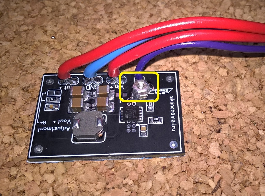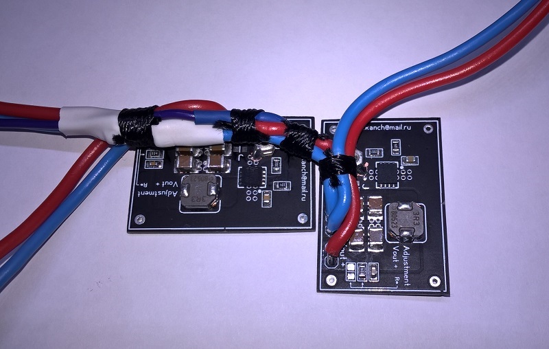 Эти модули работают и с меньшей ёмкостью. Два конденсатора для уменьшения ESR. В конечном варианте и вовсе думаю использовать низкопрофильные SMD конденсаторы.
