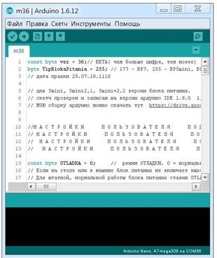 Теперь скачиваем прошивку, например из этого поста или m36.zip и сохраняем в C:\Arduino, то есть получили файл c:\Arduino\m36.zip, который нужно распаковать. После распаковки получили файлы в папке c:\Arduino\m36\m36.ino Теперь переходим снова в Arduino IDE, там выбираем файл-открыть и выбираем наш файл m36.ino, жмем открыть. Открывается новое окно с программой внутри. Вложение 50572 При необходимости изменяем значения переменных на нужные нам. По умолчанию прописаны те, которые стоят у меня в машине. (//Н А С Т Р О Й К И П О Л Ь З О В А Т Е Л Я П О Д С В О И П О Т Р Е Б Н О С Т И ) После этого жмем стрелку загрузки скетча. После компиляции (ждём) пройдет загрузка скетча Writing | ################################################## | 100% 5.48s И его проверка Reading | ################################################## | 100% 4.14s В случае удачной проверки будет сообщение. avrdude: verifying ... avrdude: 18872 bytes of flash verified avrdude done. Thank you. Вложение 50573 В процессе прошивки наблюдаем перемигивание светодиодов Rx и Tx. ВСЁ. Ардуино Nano прошита. Следующая часть |