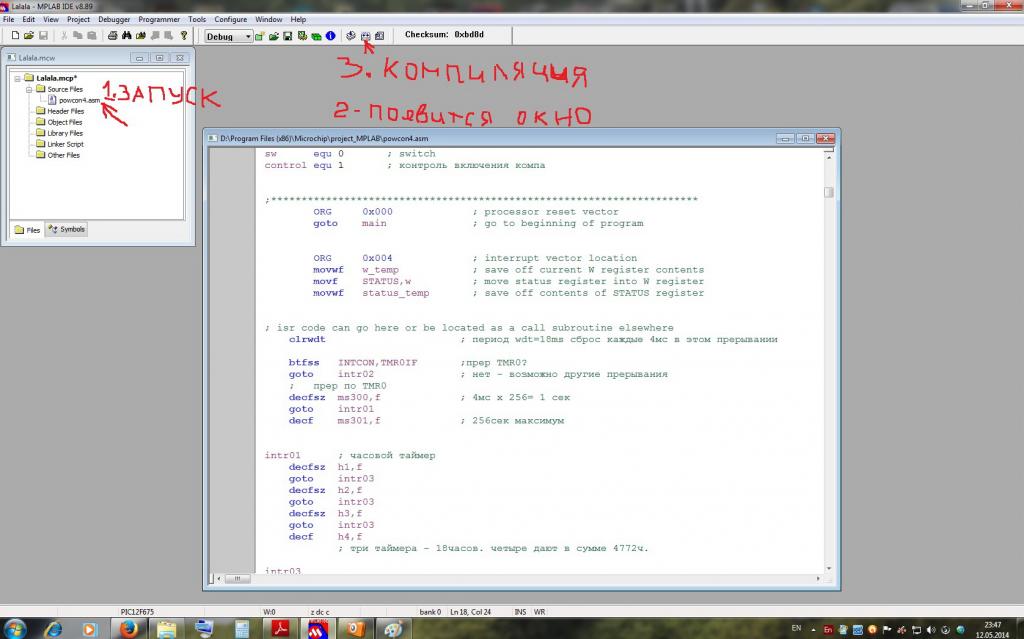 Вложение 35991 Назвать его. Положить желательно где основная программа MPLAB. На английском. Вложение 35992 Добавить окно на стол Вложение 35993 Правой кнопкой добавляем наш исходник *.asm Вложение 35994 Запускаем *.asm . Появится окно с программой. Компилируем. (проверь что внизу горит твой процессор- можно выбрать сверху в окне) Вложение 35995 Если все ок - ERROR 0! Вложение 35996 Ну это так - для затравки. Потом у тебя появятся связанные вопросы. Спросишь помогу чем смогу. |