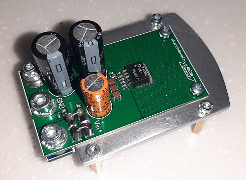 Рассеиваемая мощность линейного стабилизатора напрямую зависит от разности входного и выходного напряжения P рас.ст = Iнагр.* (Uвх — Uвых). Чем больше это значение, тем сильнее греется микросхема. Для уменьшения этой разницы между входным напряжением и напряжением на выходе, линейный модуль на регуляторе LT3083 подключил к бортовому напряжению в авто через импульсник. Напряжение выхода DC-DC преобразователя выставлено на 6,8V (оно же — напряжение входа для линейного модуля). Оба модуля собраны в "пирог" через алюминиевую пластину для дополнительного теплоотвода. Такая конструкция позволила значительно снизить температуру на корпусе LT3083 при выходном напряжении +/- 5,15V и максимальной нагрузке в 2,5А — 54°С против 75°С. При этом пульсации выходного напряжения на линейнике немного "подросли" — 2,0 — 2,5mV.