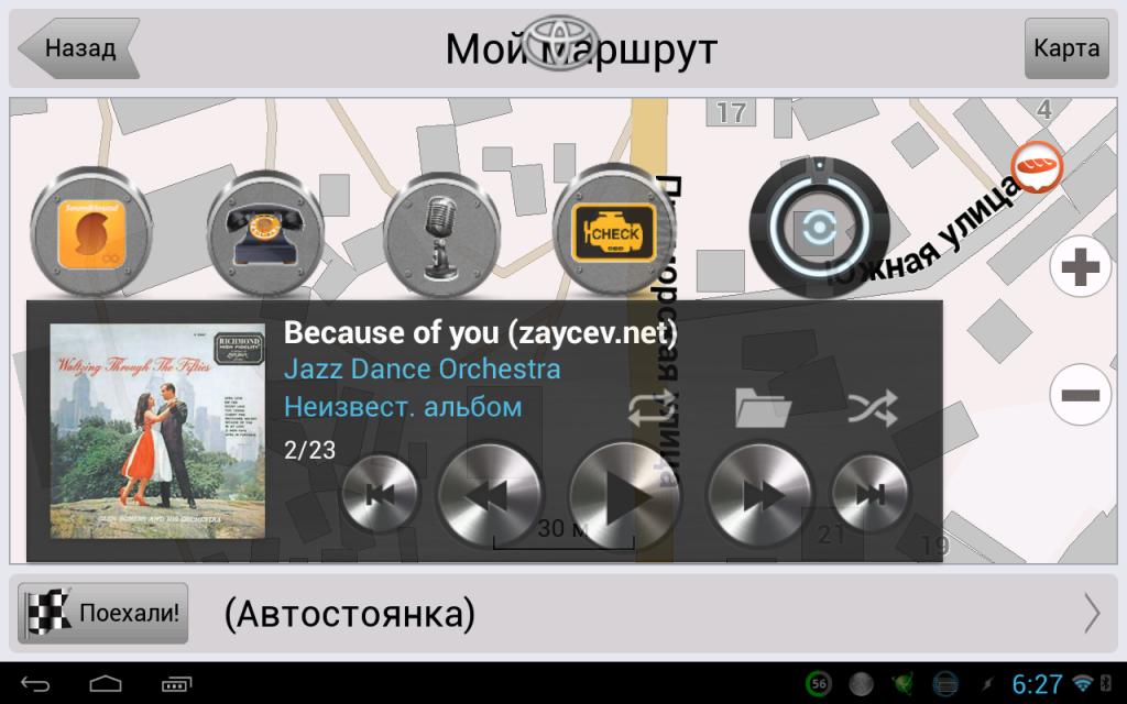 Все заработало как надо, но тут появились идеи по улучшению функционала. И так по порядку: 1. Планшет используется в основном как планшет (игрушка для ребенка, книго читалка, веб-сёрфилка, очень удобный дистанционный пульт для управления медиа центром на базе XBMC и тд...) 2. В основе лежит Apex лаунчер. Под интерфейс Carpc выделен отдельный стол: Вложение 31808 иконки (шайбы) сделаны на скорую руку, так как времени было мало, а идей много :) для вывода иконок (виджетов) используется ZOOM (мне он интересен тем, что имеет интеграцию с Tasker 3. Иконка TOYOTA запускает задачу Tasker которая: - включает bluetoth - запускает GPS bluetooth - запускает Tablet Talk - запускает Overlays floating (для вывода логотипа-кнопки которая отображается поверх всех приложений) (в настоящее время нашел решение отказаться от данного приложения и реализовал через Tasker, вообще в далеких планах реализовать все полностью на Tasker) - меняет обои - убирает нижний док-бар Apex (там иконки маловаты для попадания при вождении, хотя тут дело вкуса) В итоге все выглядит так: Вложение 31803 4. В это же время на телефоне тоже вручную запускаю (через виджет) задачу которая: - включает GPS - включате bluetooth - запускает Bluetooth GPS (платная версия) - активирует некоторые профили в Tasker 5. Для чего все это нужно?! вот как это работает на практике: - вы находитесь в пути, вам поступает входящий звонок, на планшете всплывает окно Tablet Talk, вы можете: - отбить или ответить (при нажатии ответ, на телефоне включается громкая связь и вы спокойно рулите и говорите) - при определенных входящих номерах осуществляется CallBack (т.е телефон сначала ждет 3 сек, сбрасывает линию, перезванивает на этот номер и включает громкую связь, рулите дальше) 6. Немного про иконку-логотип (Toyota) которая отображается поверх всех икон, при нажатии на нее получаем такую картинку: Вложение 31804 Вложение 31806 имеем быстрый доступ к виджету Poweramp плюс быстрый доступ к SoundHound удобно когда по радио в авто играет незнакомая мелодия, SoundHound может ее опознать (интернета в машине у меня нет, но SoundHound позволяет сохранить мелодии для опознания на потом, когда появится сеть) следующая иконка запускает TabletTalk иконка с микрофоном запускает задачу Tasker, которая распознает определенные мною комманды: - называете имя вызываемого абонента (осуществляется звонок через TabletTalk, на телефоне включается громкая связь) - фраза "пополнить телефон" используя услугу СМС банкинг через TabletTalk отсылает СМС с запросом для пополнения телефона (на заранее установленную сумму) - фраза "баланс" осуществляет звонок с громкой связью на сервисный номер и вы слышите свой остаток - комманд на самом деле много, и в принципе можно настроить все, что вам нужно... - если команда не опознана, то через голосовой движок nuance tts вы услышите, что команда не опознана и просьбу повторить ее (также если команда опознана, она дублируется голосовым уведомлением) - последняя иконка это виджет регулировки яркости Brightness level disk Вложение 31805 7. Иконка Check запускает Torque Torque настроен на сохранение определенных показаний датчиков, эти данные (путем не хитрых манипуляций) доступны в Tasker далее можно с ними делать, что угодно (например я баловался так: Torque запускался автостартом при нажатии иконки-шайбы Toyota, Tasker получал данные rpm (значит двигатель работает),скорость равна нулю (Tasker запускает задачу которая через голосовой движек говорит "Здравствуйте, вас приветсвует Т