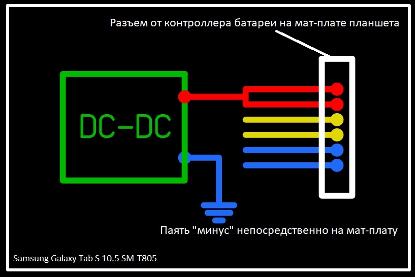 Подведу итог по подключению питания этого планшета: ниже эскиз-схема подключения внешнего питания на разъем мат-платы от контроллера батареи при котором уровень зарядки не уменьшается и показывает 100%, при этом сам контроллер не используем (удаляем).