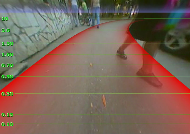 красная полоса с выделенными краями - это траектория движения автомобиля. зеленые горизонтальные полосы с цифрами - это расстояние по земле в метрах. снимать показания еще не научился - на картинке "руками" выставлен радиус в 10 м. сейчас у меня он стоит в нейтральном положении и полоски идут прямо, как научусь показания снимать - они оживут. ПО самодельное, захватывает с AverTV поток, пропускает через шумоподавитель, автовыравниватель освещенности, выпрямляет искажения (120 гр-камера очень сильно все искажает), и накладывает траекторию. Исходные данные - высота расположения камеры, угол обзора, наклон над горизонтом и радиус поворота в метрах. У меня профессия связана с цифровым видео, потому написать такое ПО не очень сложно. |