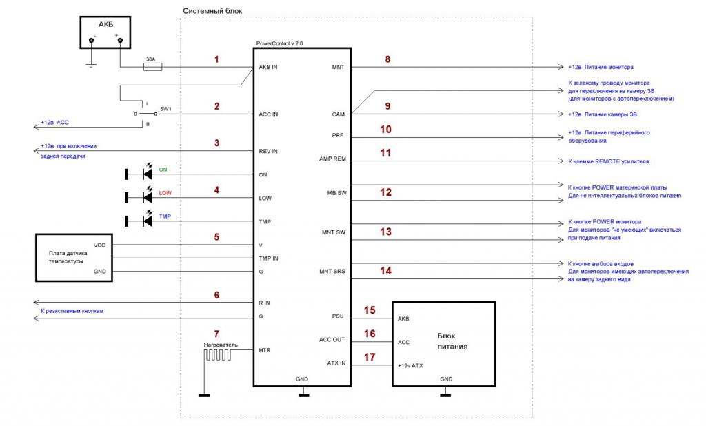 Подключаю всю схему дома на столе от БП ПК. Подключаю как уже указывал. Индикатор "ON" включается после включения "АСС IN", причём, через 30 секунд начинает мигать (как я понял, выдаёт ошибку что нет питания на "ATX IN", время задержки 30 секунд). При этом на силовые выходы, "ACC OUT", питае для монитора, идёт всего 0,06 в.