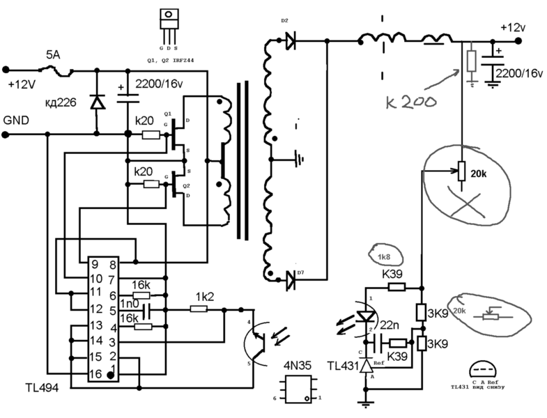 на схеме ползунок переменника соедини с крайним выводом и еще при таком номинале R8 не греется должен быть ну очень горячим там в самый раз 240-300 ом, и что то я не понял место где tl431 по моему что то не с сопротивлениями как то в оригинале по другому