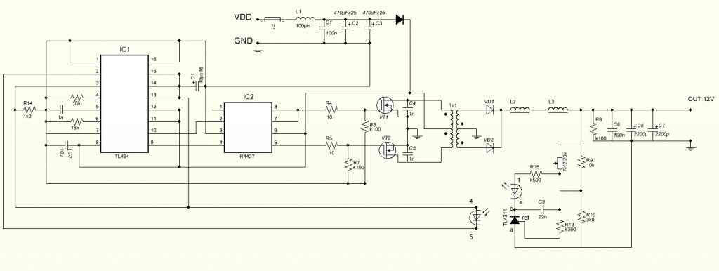Представлена только схема упрвления, силовую часть не могу найти... Только на маркировку транзисторов не смотрите - там стандартные из библиотеки взяты. Ставил всякий мусор который можно выковырять из БП и работало. |