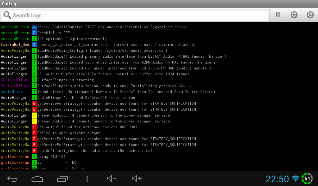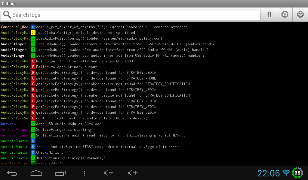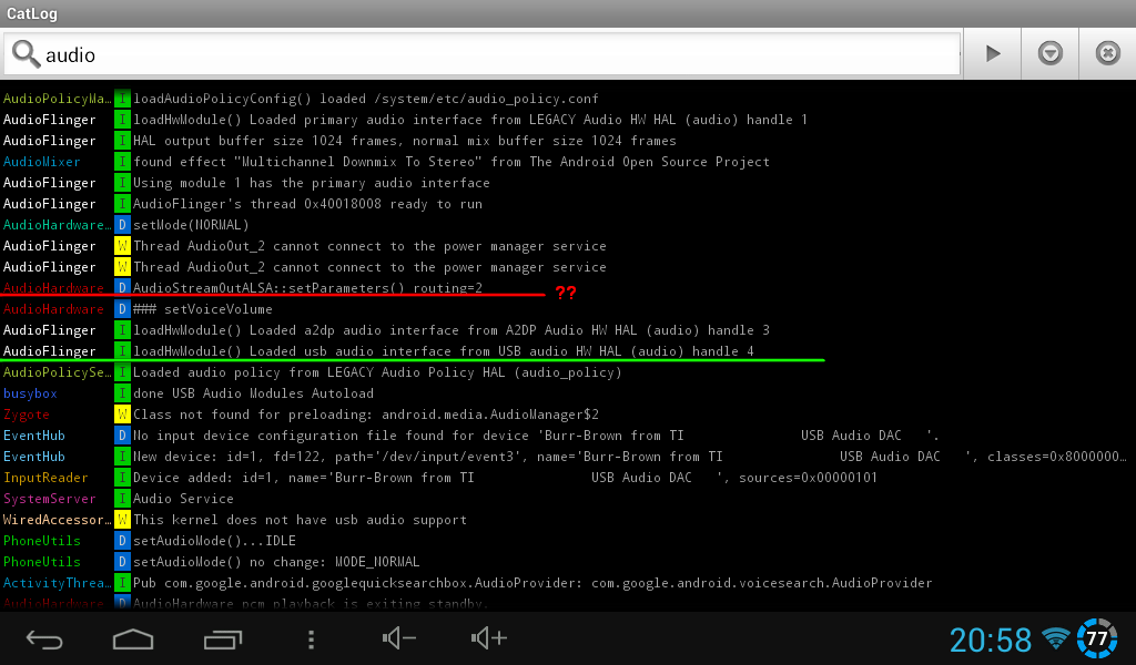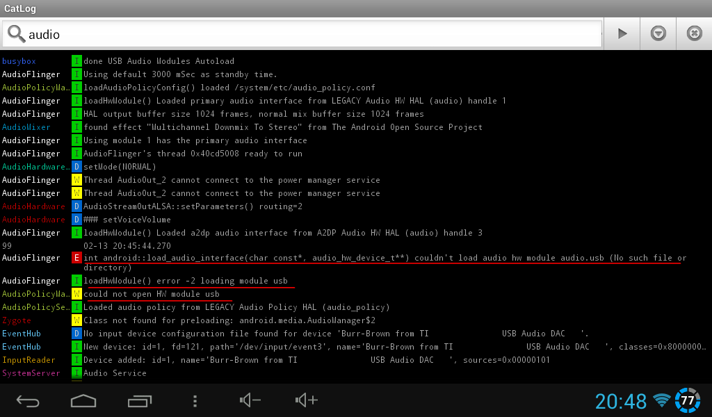 Прошивка Аndroid 4.1.1, модули звука грузятся автоматом скриптом из init.d. Карта определяется. Вложение 29818 По умолчанию либы audio.usb.default.so в папке /system/lib/hw нет. В логах видно, что система пытается ее найти...с картой или без.. Вложение 29819 Далее кидаю туда эту либу от нексуса7 из стоковой прошивки 4.1.2. И она вроде успешно грузится. Вложение 29820 И почему сервис ругается на отсутствие поддержки в ядре? Вложение 29821 ....что дальше то делать? |