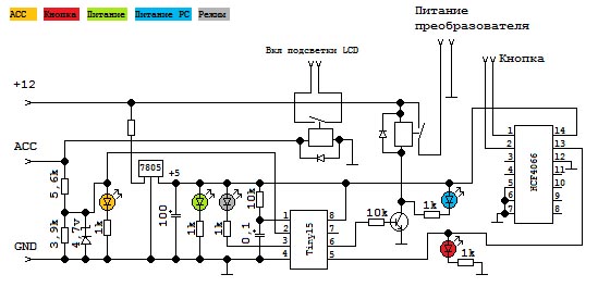Преобразователь 12-9 собран на LM2576 по схемке из ее даташита, настроен на 9.2в. туда-же прикручен еще 7805 для 5в линии. "Мозг" блока питания пока только обкатывается и тестируется.. и так Версия "А" Вложение 10771 пайка конечно не Айс :), но тут главное размеры. собрано, примерно, по такой схеме Вложение 10772 алгоритм работы: при включении АСС.. включаем питание преобразователя, ждем Х-сек, нажимаем кнопку, ждем Y-сек, считаем что комп включен при отключении... гасим подсветку LCD, ждем М-сек, нажимаем кнопку, ждем Y-сек, считаем что комп выключен, ждем N-сек и отключаем питание.. |