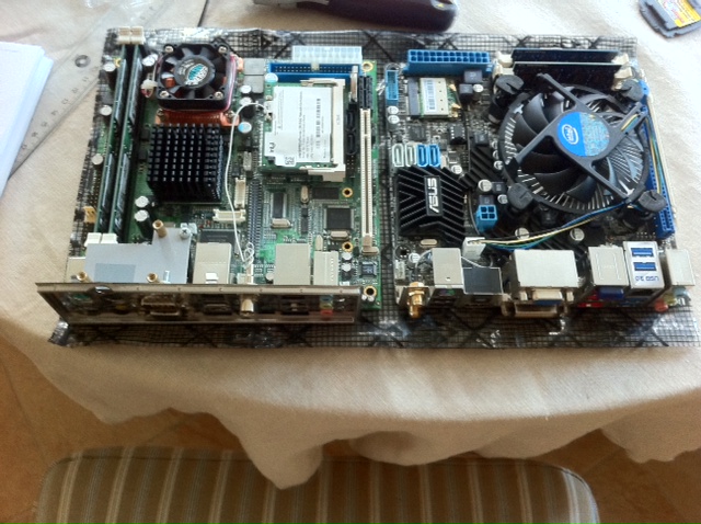 Легким движением руки отключив питание монитора перед загрузкой компа (и тем самым типа убив петлю по земле через питание (землю кузова в багажнике) - тачскрин - мать - бп (опять же завязанный на землю кузова в багажнике)) я опять словил глюки при загрузке. Соответсвенно, дело не в этой петле. Идея насчет этих нехитрых манипуляций, к сожалению, дошла до меня уже после покупки бп монитора с гальванической развязкой :big: Вопщем переходим к тяжелой артиллерии - замена материнки. Набор из предыдущего поста, выбран по причине нормальной производительности и низкого энергопотребления. Что примечательно, боксовый кулер i3-2100t существенно ниже стандартных боксовых кулеров процессоров i3-i5-i7 и легко влазит в корпус Voom-PC. к процессу замены я подошел со вкусом и расстановкой, так что одного выходного не хватило :big: Итак, слайды... Это, собственнно, с чего начали: Вложение 22393 Вложение 22394 Вложение 22395 Вложение 22396 А тут, наконец, мне попался шумный кулер, который раздражающе зудел у меня в багажнике последние полгода. Провинившийся кулер удален и заменен на абсолютно такой же кЕтайский кулер (та же фирма и т.д., что наводит на мысли о долговечности конструкции :whistle: - но это какбэ единственный кулер с такими размерами и тахометром, найденный в Москве). Вложение 22397 Вложение 22398 А это так сказать сайд-бай-сайд новая мать и старая. Можно нати 10 отличий... Вложение 22399 Продолжение следует... |