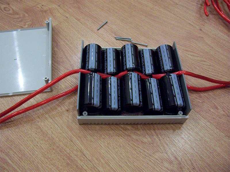 вот что из этого получилось. 10 конденсаторов по 47000 мкФ, запаял прямо на провод который будет запитывать усилитель, провод 10см.кв. (жаль в наличии был только красный), запихал все это в коробку из чипдипа. Жаль емкость померить не чем.