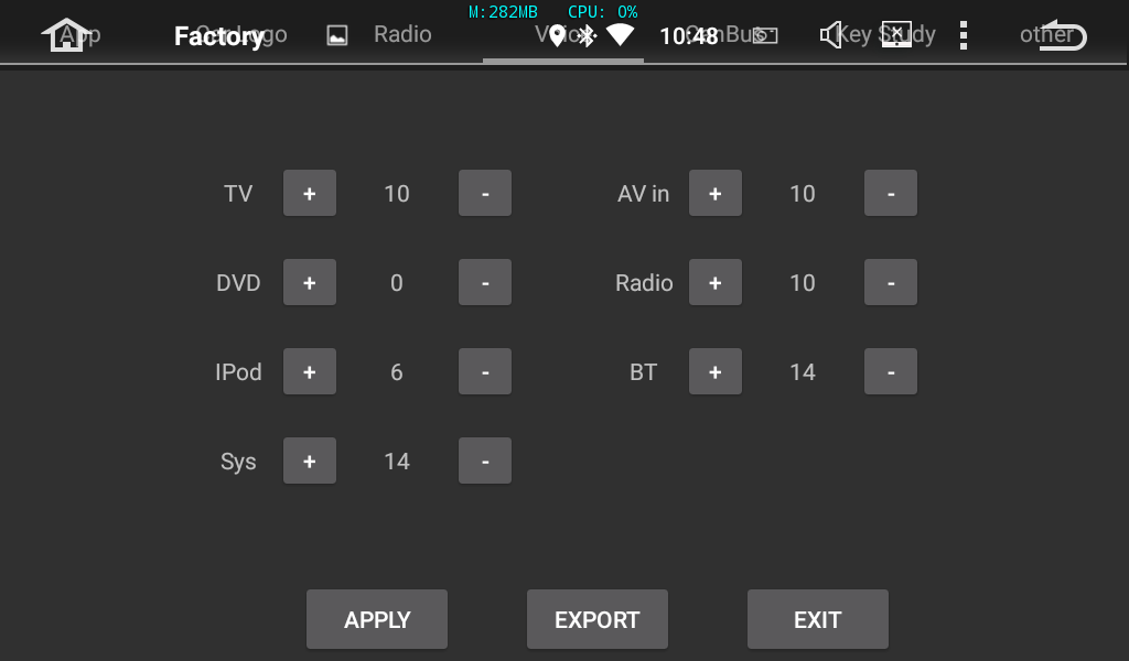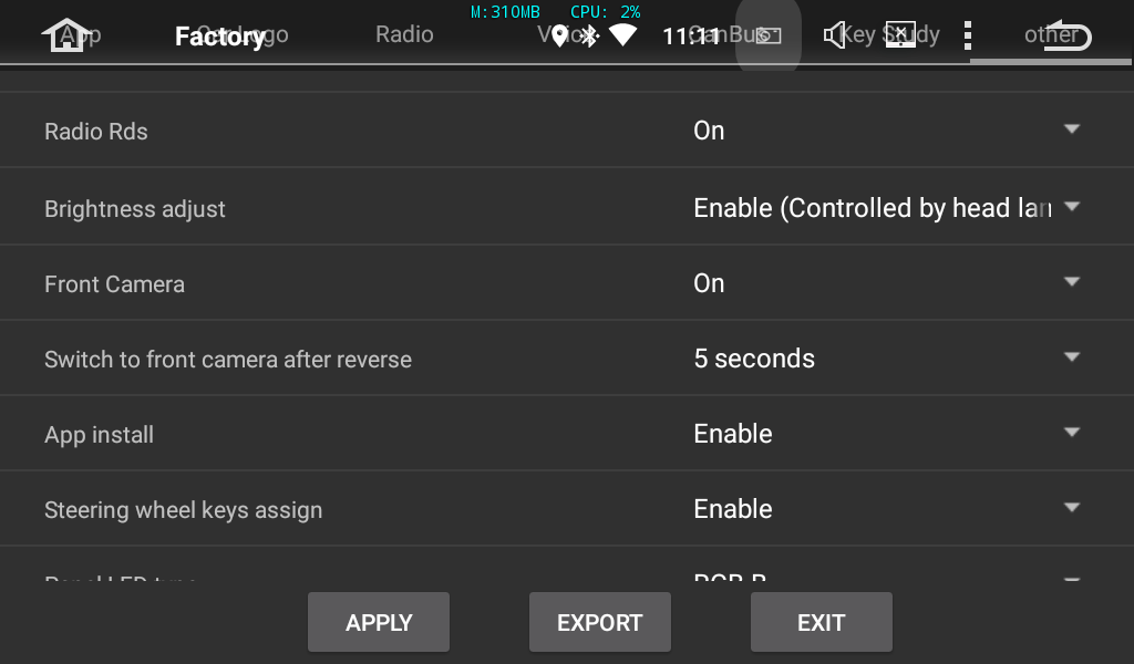 Вложение 44749Вложение 44750 При отключении АСС можно задать таймаут полного отключения до 2-х часов Вложение 44751 Уровень всех источников можно выровнять как удобно Вложение 44752 Подсветку кнопок можно включить с подачей питания или с включением от проводка ILL Яркость для КЗХ можно выставить свою (последний пункт) Вложение 44753 Яркость экрана в любой момент можно уменьшить сразу до минимума нажав на дисплей с крестиком в строке состояния и там-же выбрать нужную. Можно включить отображение передней камеры после выключения задней на нужное время (от 1 до 10 сек), и оно таки работает, вот только этот вход китайцы не вывели наружу в этой магнитоле :rofl: Вложение 44754 |