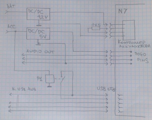 Схема подключения: Вложение 30363 Дома примитивная док-станция, если что понадобится. Вложение 30364 По алгоритму работы: Автостарт при подаче внешнего питания на pogo pins Выключается tasker-ом с задержкой при отключении внешнего питания По встраиванию - спасибо дедушке Форду! Вложение 30365 |