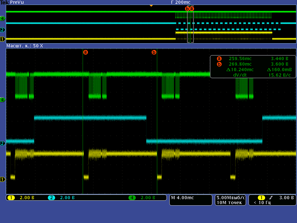 На моих 2-х экземплярах тача с GT911 этот интервал от 10 до 13 мСек. http://pccar.ru/attachment.php?attac...1&d=1472798284http://pccar.ru/attachment.php?attac...1&d=1472798284 Теперь реальности: Вложение 46606 Канал 1 INT от тача - интервал 10.24 mS Канал 2 каждый перепад - передача координат по USB ~16 mS Канал 4 SCL, т.е. чтение координат по I2C из контроллера тача. т.е. координаты реально уходят с интервалом ~16 mS по USB. Как по мне, так предостаточно... Ну и раз пошла такая пьянка :spiteful: |
