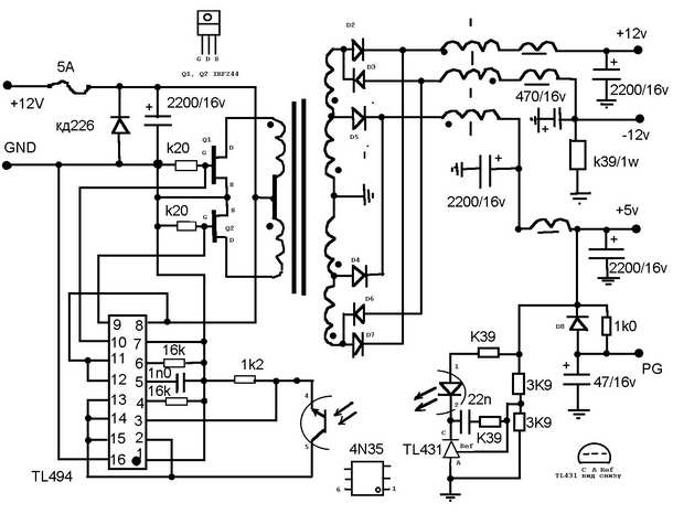 если мать работает от сетевого БП (на 494-й) что то я не соображу, а что ей здесь то не работать? схема то один в один после транса! может посмотреть схему обратной связи на сетевом БП