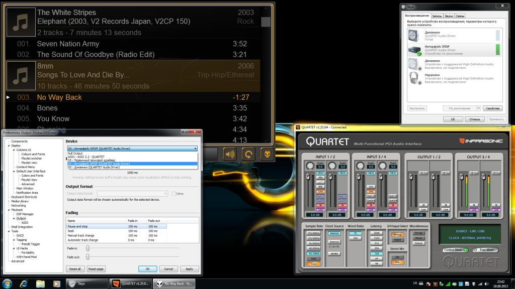 Насчёт вывода звука: Я так понимаю, что при правильной настройке вывода звука через ASIO, регулировка громкости в Windows и в Foobar работать не должны.. И такая вот правильная настройка говорит о том, что со стороны компьютера звук вообще не подвергается никакой обработке, и громкость регулируется на внешнем устройстве (цап/аудиопроцессор/ресивер) в аналоге с мизерным минимумом искажений.. Чего я собственно и добиваюсь.. А у меня вроде-бы всё и настроено, но громкость я могу регулировать абсолютно везде.. Может, кто подскажет, что я делаю не так? Или у меня неправильное понимание регулировки громкости?..