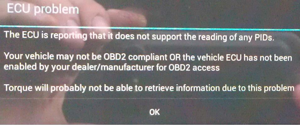 На самом деле он пишет, что Бортовой Компьютер (ECU) говорит, что он не поддерживает считывание каких либо PID. Ваша машина либо OBD2 не совместима, либо производитель/диллер заблокировал ECU от диагностики по протоколу OBD2. Про TORQUE - все правильно. Я бы сказал, что связи нет. Либо у тебя не OBD2 стоит, либо что-то в этой приблуде не так. |