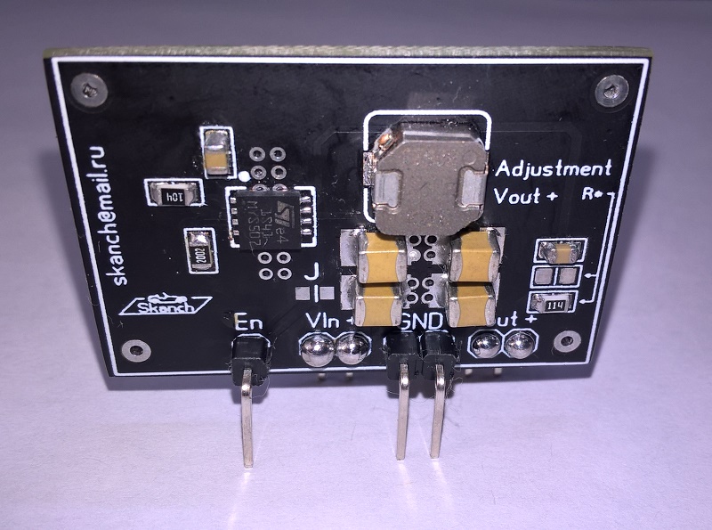 Вложение 51025 Вложение 51024 Без дополнительного охлаждения при выходном напряжении 5,14В и токе нагрузки в 2,5А через 2 часа непрерывной работы температура на микросхеме 62С( с увеличением нагрузки температура начинает сильно расти). Напряжение стабильное, пульсации на выходе не более 60mV. Добавил небольшой радиатор с обратной стороны платы, приклеив его через теплопроводящий скотч 3М. Вложение 51026 Вложение 51028 Вложение 51027 Теперь при температуре на микросхеме в 65С ток нагрузки увеличился до 3А. Выходные параметры напряжения не изменились. Собственное потребление во включённом состоянии без нагрузки 2мА, в выключенном состоянии с подтяжкой к "массе" управляющего пина "EN" ток потребления 3μA. Для более устойчивого положения на общей плате штыри распаяны в шахматном порядке. Вложение 51029 Вложение 51030 Как отдельный модуль для питания планшетов ( и не только) с током нагрузки до 3А вполне подходит. В архиве плата в формате lay6 и файл Gerber для заказа на производстве. Вложение 51032 P.S. На очереди тест микросхемы ST1S10PUR в таком же корпусе. Поскольку распиновка абсолютно одинаковая, то плату менять не придётся. |