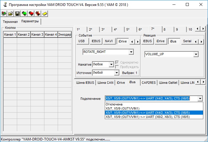 Вложение 49796 Поддержка включает в себя 2 режима: — работа в системе (есть штатное ГУ); — автономная работа (штатное ГУ заменено на карпс). Для кнопок есть возможность задать действия на короткое, длинное и любое нажатие. Подключение, шина: X5/8 и X5/10 вместе — шина LIN, необходимо подключить резистор подтяжки 1К между шиной и +12V Перечень событий, Ручка громкости: ENCODER_VOL_UP ENCODER_VOL_DN KEY_MUTE Кнопки: KEY_BACK KEY_MEDIA KEY_HOME KEY_NAV KEY_FAV Джойстик: ENCODER_UP ENCODER_DN KEY_OK KEY_LEFT KEY_RIGHT KEY_UP KEY_DN версия оболочки настройки тут, ПО контроллера тут |
