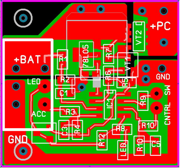 Немного доработанная плата. Увеличена толщина проводников. Добавлена площадка для доп транзистора по линии LED. Возмжно использование этой линии для включения внешних устройств, вместо светодиода. Например усилителя.