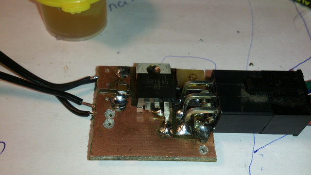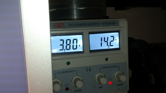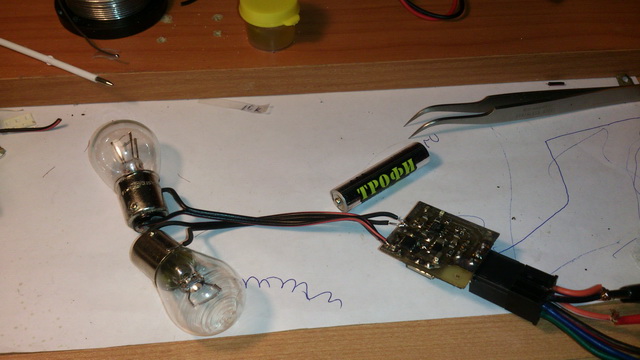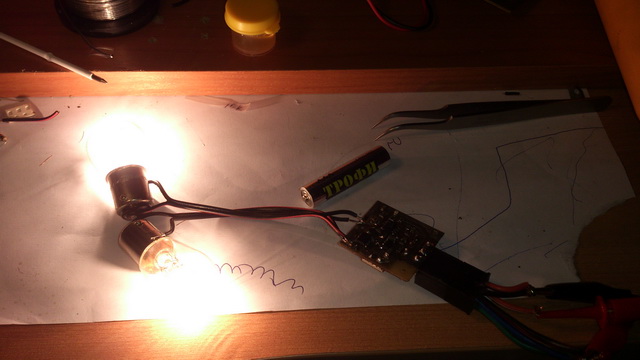 Прототип. Предварительные испытания. Нагружал пока до 4А. Ключ холодный. Потери напряжения на нем 10мВ, при токе 4А! В качестве нагрузки 2 лампы на 21 Вт. Думаю и на 55 Вт лампу потянет, но и 4А - достаточно пока. Это втрое больше моих нужд по току.