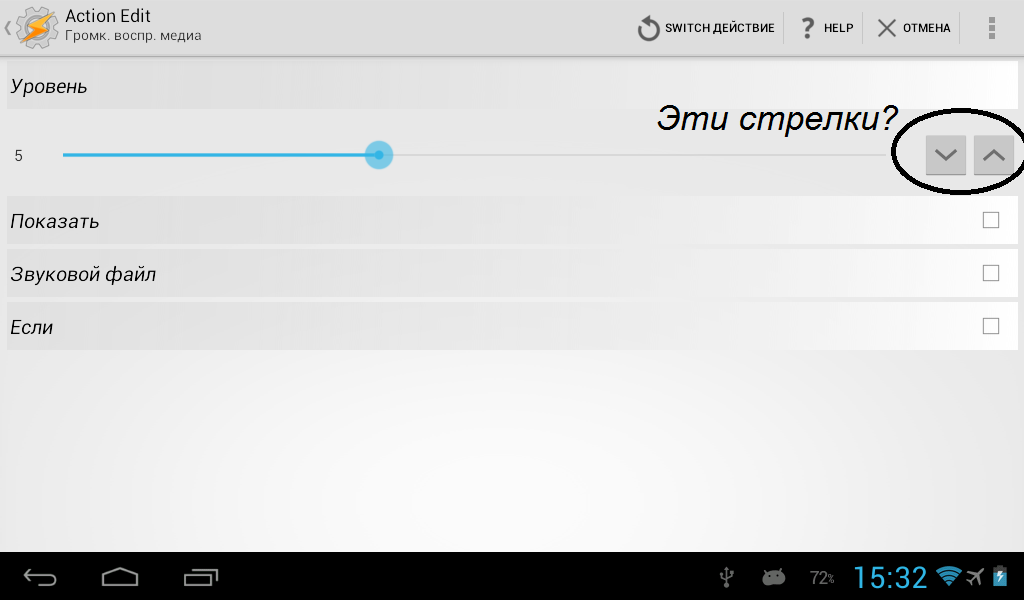 на кнопки звука накладываем в сценах таскера прямоугольник с прозрачным фоном (либо кнопки звука делаем поверх фона) далее действие tap (там же в сценах) на этом объекте... при нажатии на громкость вверх такое действие установить переменную %MYVOLUME=%VOLM (в этой переменной хранится текущий уровень звука для медиа потока)+1 (или какой шаг нужен) (устнаовить значек мат.операции) установить громкость до переменной %MYVOLUME для убавления тоже самое только -1 p.s. можно добавить также при нажатии либо какойто beep звук либо вибру |