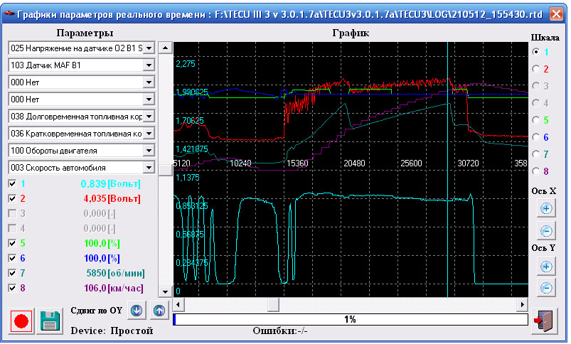 PS Вчера специально обратил внимание на работу машинки в диапазоне 2000…3000 об. В небольшую горку у меня заметный подхват чувствуется где-то после 2600, на 3000 машинка идет уже резво. PSS Дезактивируй и скрой лишние параметры, а профиль сохрани. PSS Об отравленности ката не берусь судить, но обычно ЭБУ в этой ситуации не церемонится и сразу зажигает ошибку 0420. Видать по всему – ситуация с катом терпима. «Забитость» можно еще проверить по максимальным показаниям МАФ, в режиме «тапок в пол и в гору» должно быть 4 В, если все в норме (чистый выпуск, нет проблем с подачей топлива и пр. пр.) |