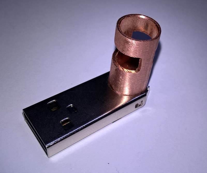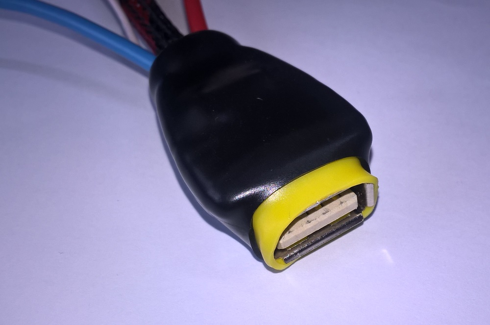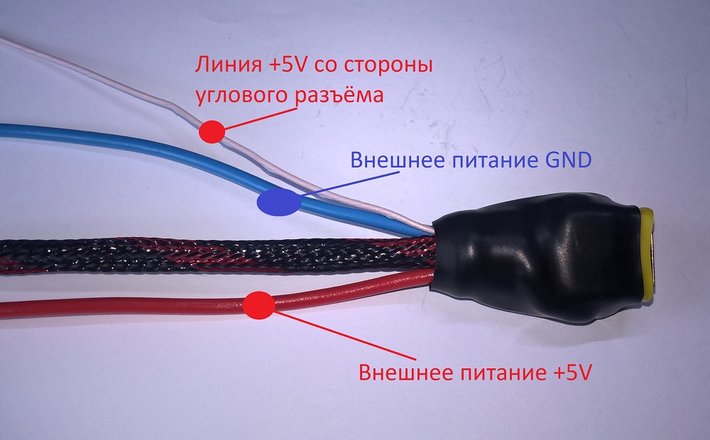 Вложение 51712 Вложение 51713 Вложение 51714 Вложение 51715 Вложение 51716 Вложение 51717 Вложение 51718 Вложение 51719 Конструкция очень жёсткая, кабель внутри не болтается. ------------------------------------------ С противоположной стороны у кабеля USB-A гнездо с выводами проводов для внешнего питания. Вложение 51720 Вложение 51721 Вложение 51722 Вложение 51723 Вложение 51724 Вложение 51725 Вложение 51726 Вложение 51727 ------------------------------------------- Линия питания +5V в кабеле разорвана и провод со стороны углового разъёма выведен наружу. Сделано для предотвращения конфликта встречного питания. Дополнительное внешнее питание подаётся на USB-A гнездо. Если внешнее питание не используется, то соединив вместе провод со стороны углового разъёма с красным проводом со стороны гнезда, получаем стандартный data-кабель. USB-кабель с угловым разъёмом делался для такой "головы". При подключении разъёма, кабель "уходит" вверх. Вложение 51728 ------------------------------------------- Ниже варианты кабеля с разъёмом mini USB Вложение 52517 и micro USB Вложение 52518 |