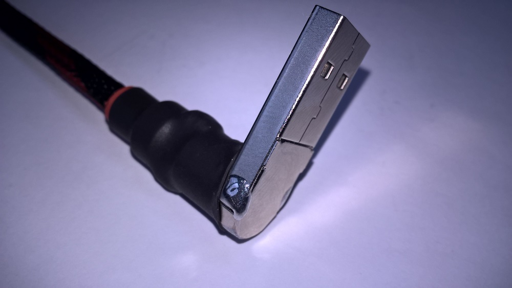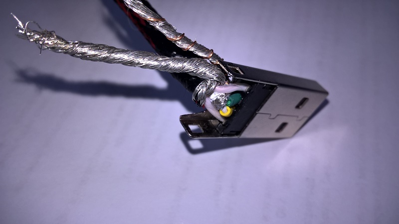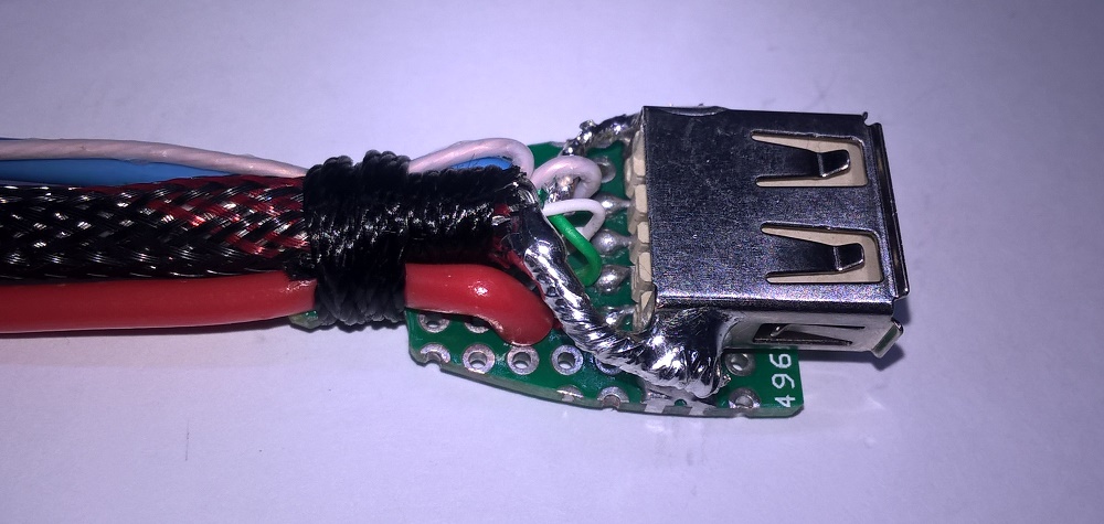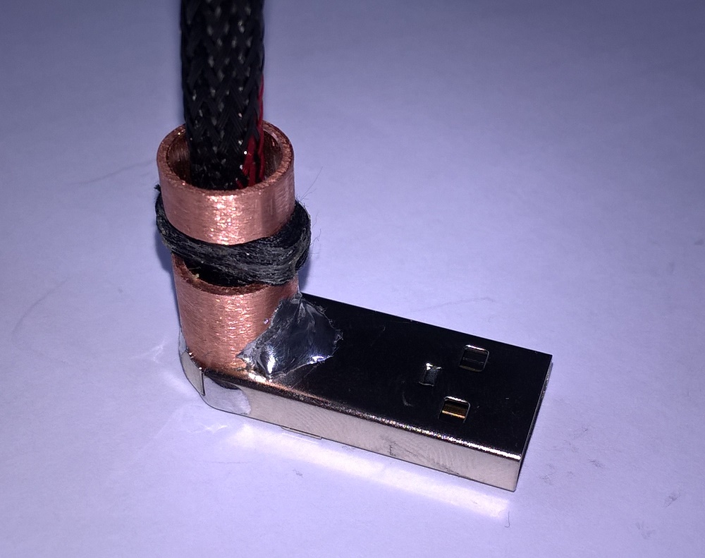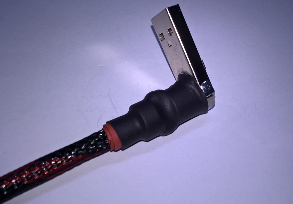 Потребовалось сделать USB кабель с угловым разъёмом USB-A (плоский) с определённой ориентацией положения контактов. Ниже пошаговая инструкция изготовления подобного "шнурка" в картинках (используются фото процесса изготовления двух кабелей и некоторые детали могут не совпадать).