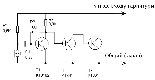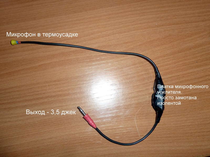 Вложение 30412 Капсюль взят электретный самый обыкновенный и самый маленький в маленьком радиоларьке за смешные деньги (15 руб). Схемка спаяна на маленьком куске макетки. К ней припаян на куске экранированного провода микрофон и выведен выходной сигнал на 3,5 джек. Вложение 30420 Вложение 30413 (На рисунке распайка джека стандартной гарнитуры, а не моего выходного джека) Для 4х контактного джека подключаемого на выход девайса спаян разветвитель на 2 гнезда: стерео аудио выход и микрофонный вход. Платка pамотана изолентой, экранирование не понадобилось. Заработало с первого раза. Уровень сигнала получился оптимальный. Подстойки усиления не потребовалось. Орать в салоне не надо. Помех нет. |