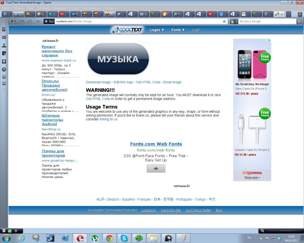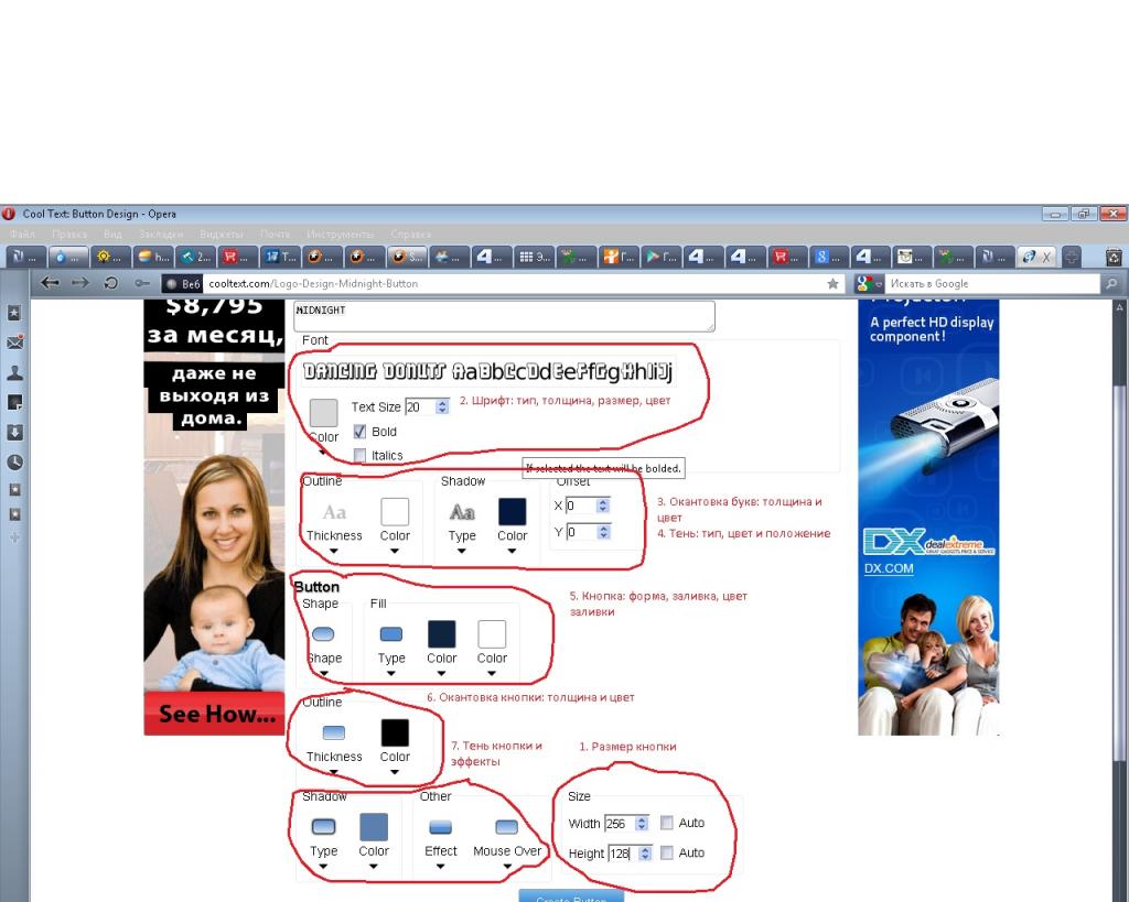 1) Начинаем с главной страницы http://cooltext.com/ и выбираем примерно подходящую кнопку (шаблон) Вложение 30725 2) Ввводим надпись, выбираем тип шрифта, толщину, цвет, окантовку и тд. Вложение 30726 3) Жмем внизу станицы "Create button" и получаем готовую кнопку и ссылку для скачивания Вложение 30727 |