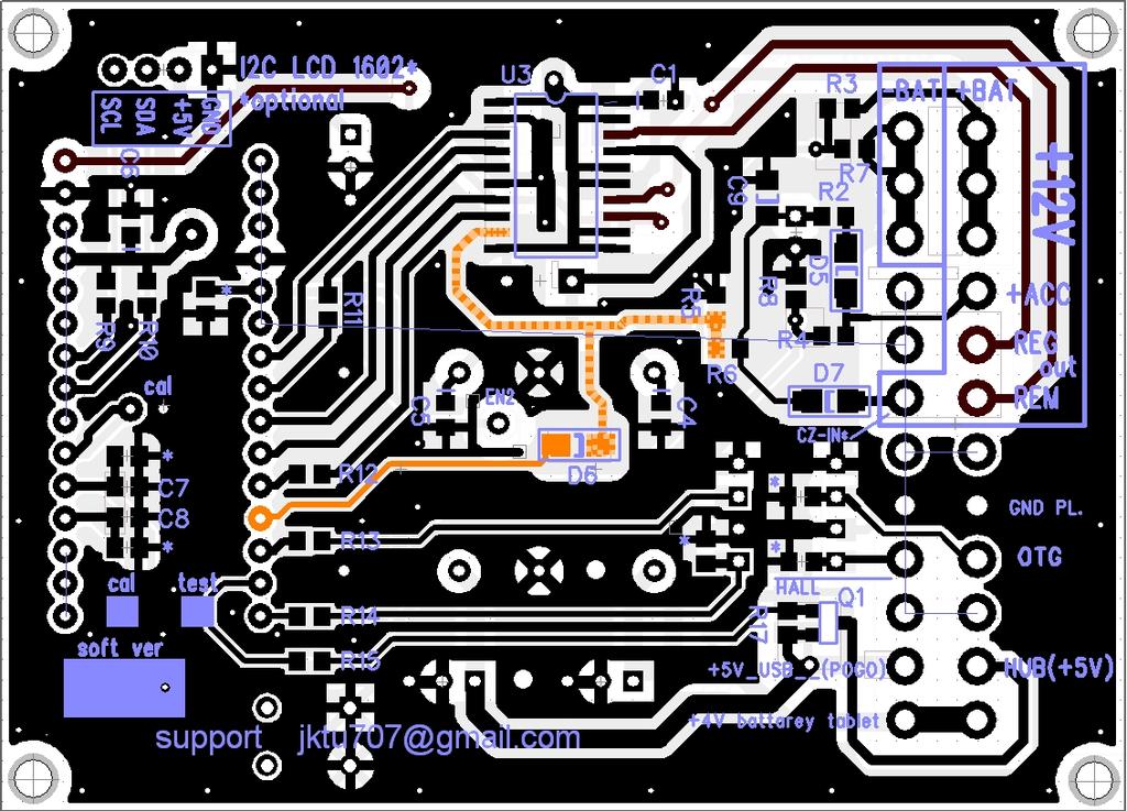 Когда процессор посчитал, что напряжений достаточно и зажигание включено, то начинается включение следующего: включаем самозапитку ардуино, и, соответственно, процессора Для этого включаем логическую единицу (+5В) на D9 ардуины. Напряжение идет через диод D6 на управляющую ногу IN4 интеллектуального ключа ITS724G. Теперь при выключении ACC можно поддерживать питание блока. Что при этом происходит, рассмотрено чуть выше. Вложение 50333 Далее включаем вывод информации на дисплеи I2C. Поддерживаются дисплеи: i2c 1602Вложение 50334 и SSD1306Вложение 50335 Так выглядит индикация на дисплее для версии скетча m34 Вложение 50337Вложение 50338 ================ |000:00 110212.10| |2616 01110 14.50| ================ 1 строка |000:00 110212.10| вывод часов:минут: - ОБЩЕЕ время работы процессора (полное время работы БП без отключения) |2616 01110 14.50| |000:00 110212.10| flagAKB - вывод флага AKB |2616 01110 14.50| |000:00 110212.10| flagACC - вывод флага AСС |2616 01110 14.50| |000:00 110212.10| REM - вывод rem 1-усилитель звука включен, 0 - выключен |2616 01110 14.50| |000:00 110212.10| flagREM - вывод флага!!! rem 1-усилитель звука включен, 0,2 - выключен |2616 01110 14.50| |000:00 110212.10| вывод напряжения АСС |2616 01110 14.50| 2 строка |000:00 110212.10| |2616 01110 14.50| вывод кол-ва минут, оставшиеся до вЫключения блока (когда выключено АСС) |000:00 110212.10| |2616 01110 14.50| STARTUEM - Стартует ли авто ( крутим ли стартером) 0- не крутим, 1 - крутим. |000:00 110212.10| |2616 01110 14.50| OTG - вывод флага OTG |000:00 110212.10| |2616 01110 14.50| HUB - вывод флага HUB |000:00 110212.10| |2616 01110 14.50| вывод флага FIVE_Volt_OUT_na_POGO_or_USB ((ПРИЗНАК ЗАРЯДКИ или зарядка на юсб)) |000:00 110212.10| |2616 01110 14.50| вывод флага flagHALL 1-экран включен, 0 - выключен |000:00 110212.10| |2616 01110 14.50| вывод напряжения АКБ Cледующая часть |