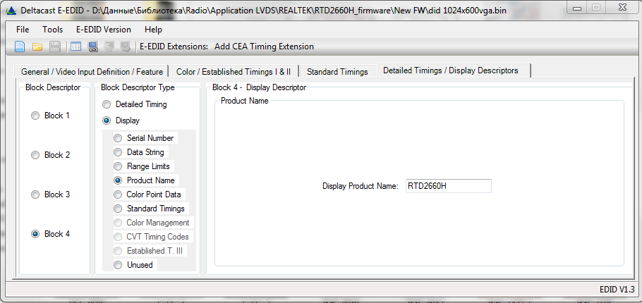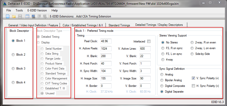 Но все же некоторые особенности разжую. Итак, EDID - блок объемом 128 байт. Обращаю на это внимание, поскольку некоторые редакторы из-за кривизны могут сделать его и другого размера. Тогда нужно в HEX редакторе оставить 128 байт, а остальные "нули" удалить. Для создания массива EDID чаще всего используют программу EDID-Editor. Их бывает много, но суть одна. Для того, чтобы создать блок EDID помимо основных (разрешение, частота) нужно иметь некоторые данные, имеющие отношение к временнЫм характеристикам матриц, т.н. тайминги. В некоторых даташитах на матрицы EDID выкладывают как есть готовый, в других - нет. Тогда его нужно рассчитать исходя из таймингов на матрицу. Однако зачастую тайминги бывают довольно мудро зашифрованы и разобраться довольно сложно. Вот тогда в помощь годится очень полезное понятие - моделайн. Это массив неких усредненных данных, который является расчетом из исходных разрешения и частоты обновления экрана. Причем хоть и данные усредненные, но их вполне достаточно, чтобы заработали любые матрицы равного разрешения - большинство временных параметров матриц имеют "ворота". К сожалению калькулятор моделайна в виде самостоятельной программы я не могу выложить (я попросту его не встречал), но есть сайт, на котором онлайн можно это сделать: http://www.arachnoid.com/modelines/ Заходим туда, а там все очень просто. Не буду пояснять слишком глубоко, нам интересна таблица Required inputs. Правая таблица - это опциональная и для разжевывания ее нужно время, при том что сами опции не сильно то требуются в нашем случае. Ниже по тексту идет расшифровка некоторых понятий и величин. Даже рисунок, который тоже многое объясняет. Вводим разрешение, например 1024*600 и частоту 60Гц. Результат: # 1024x600 @ 60.00 Hz (GTF) hsync: 37.32 kHz; pclk: 48.96 MHz Modeline "1024x600_60.00" 48.96 1024 1064 1168 1312 600 601 604 622 -HSync +Vsync Ну а теперь подвожу к тому, для чего все это нужно. Взглянем на окно программы EDID Editor Вложение 42187 Как видим, для создания массива EDID нужны тайминги, которые я обвел прямоугольником. Вот их то мы и берем из моделайна. Итак, как они там "зашифрованы": "1024x600_60.00" 48.96 1024 1064 1168 1312 600 601 604 622 -HSync +Vsync" - 1024x600_60.00: Resolution_Refresh (Hz, после точки - дробная часть) - 48.96: Pixel Clock (MHz, после точки - дробная часть) - 1024: H. Active Pixels - 1064: H. Start of Sync Pulse - 1168: H. End of Sync Pulse - 1312: H. End of Blanking Interval - 600: V. Active Lines - 601: V. Start of Sync Pulse - 604: V. End of Sync Pulse - 622: V. End of Blanking Interval -HSync +Vsync - эти "галочки" ставятся в программе расчета. Я намеренно не стал переводить все строчки, потому что в программах расчета по-русски не бывает. H и V - означает, что величина относится к горизонтальным и вертикальным параметрам соответственно. Поскольку для расчета нужны еще и некоторые промежуточные параметры, поэтому привожу, как они взаимосвязаны с уже имеющимися: H. Start of Sync Pulse = H. Active Pixels + H. Sync Offset H. End of Sync Pulse = H. Start of Sync Pulse + H. Sync Width H. End of Blanking Interval = H. Active Pixels + H. Blank Pixels и точно так же для "вертикали": V. Start of Sync Pulse = V. Active Lines + V. Sync Offset V. End of Sync Pulse = V. Start of Sync Pulse + V. Sync Width V. End of Blanking Interval = V. Active Lines + V. Blank Lines В этих взаимосвязях вы найдете все необходимые для расчета величины. Их же можно взять для подстановки не только в редактор EDID, но и в любой другой (например EMGD). Да, вот еще, иногда в редакторах некоторые тайминги называют по разному. Поэтому привожу известные мне вариации: H. Sync Offset = H. Front Porch V. Sync Offset = V. Front Porch Теперь можно перейти к практике. Напомню еще один важный момент. Для какой цели нужен блок edid - от этого зависит как