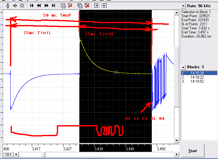 Играл настройками длительности СТАРТ\СТОП импульса в файле dnk, при этом смотрел осциллограмму напряжения на k-line. Заметил следующее;