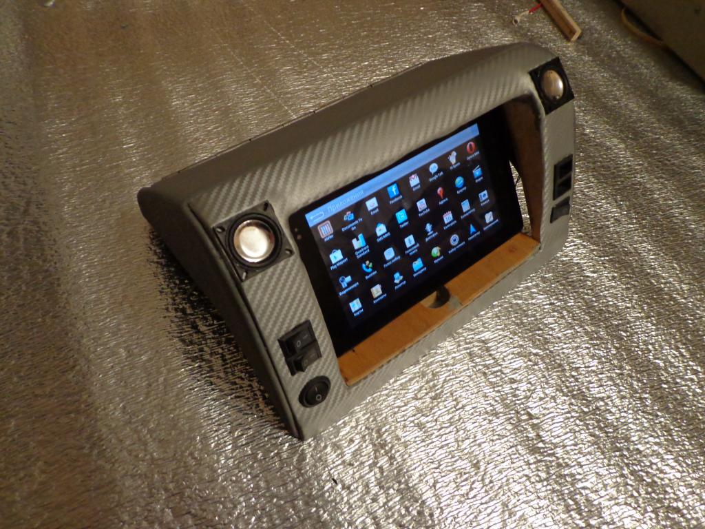 Сделал переходную площадку для нижней части консоли,чтобы разместить планшет как нужно. Осталось,вновь обтянуть карбоновой плёнкой,приделать кнопки,подключить питание к кнопкам,подключить динамики и расположить их в консоли,найти защитные решётки для динамиков.Покрыть всю внутреннюю часть консоли серым карпетом..и..установить в машину. Есть одно но..Данный проект считаю предэтапным..т.к. делаю консоль на будущее..В конце всё же размещу,что-то более существенное либо другой планшет со всеми выходами включая регистрацию и полноценный юсб-хост,либо carpc на базе старого ноутбука.. |
