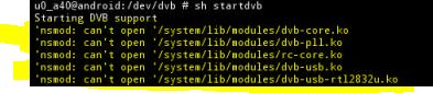 1) поправил пути к модулям в скрипте startdvb echo "Starting DVB support" insmod /system/lib/modules/dvb-core.ko insmod /system/lib/modules/dvb-pll.ko insmod /system/lib/modules/rc-core.ko insmod /system/lib/modules/dvb-usb.ko insmod /system/lib/modules/dvb-usb-rtl2832u.ko echo "Waiting for device" sleep 5 cd / mkdir /dev/dvb chmod 777 /dev/dvb mkdir /dev/dvb/adapter0 chmod 777 /dev/adapter0 cd /dev/dvb/adapter0 ln -s /dev/dvb0.frontend0 frontend0 ln -s /dev/dvb0.demux0 demux0 ln -s /dev/dvb0.dvr0 dvr0 ln -s /dev/dvb0.dvr0 dvr0.ts chmod 777 /dev/dvb* echo "DONE!" 2) затем закинул скрипт startdvb и модули (dvb-core.ko, dvb-pll.ko, rc-core.ko, dvb-usb.ko, dvb-usb-rtl2832u.ko) в папку dev/dvb 3) затем в терминале набираю команды su cd /dev/dvb sh startdvb после чего выдает то что на скрине |
