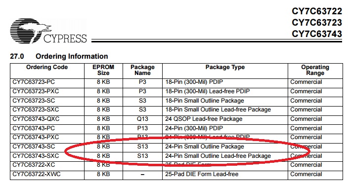 наконец то пришла с китая микросхемка. только они прислали не CY7C63743-SXC, а CY7C63743-SC